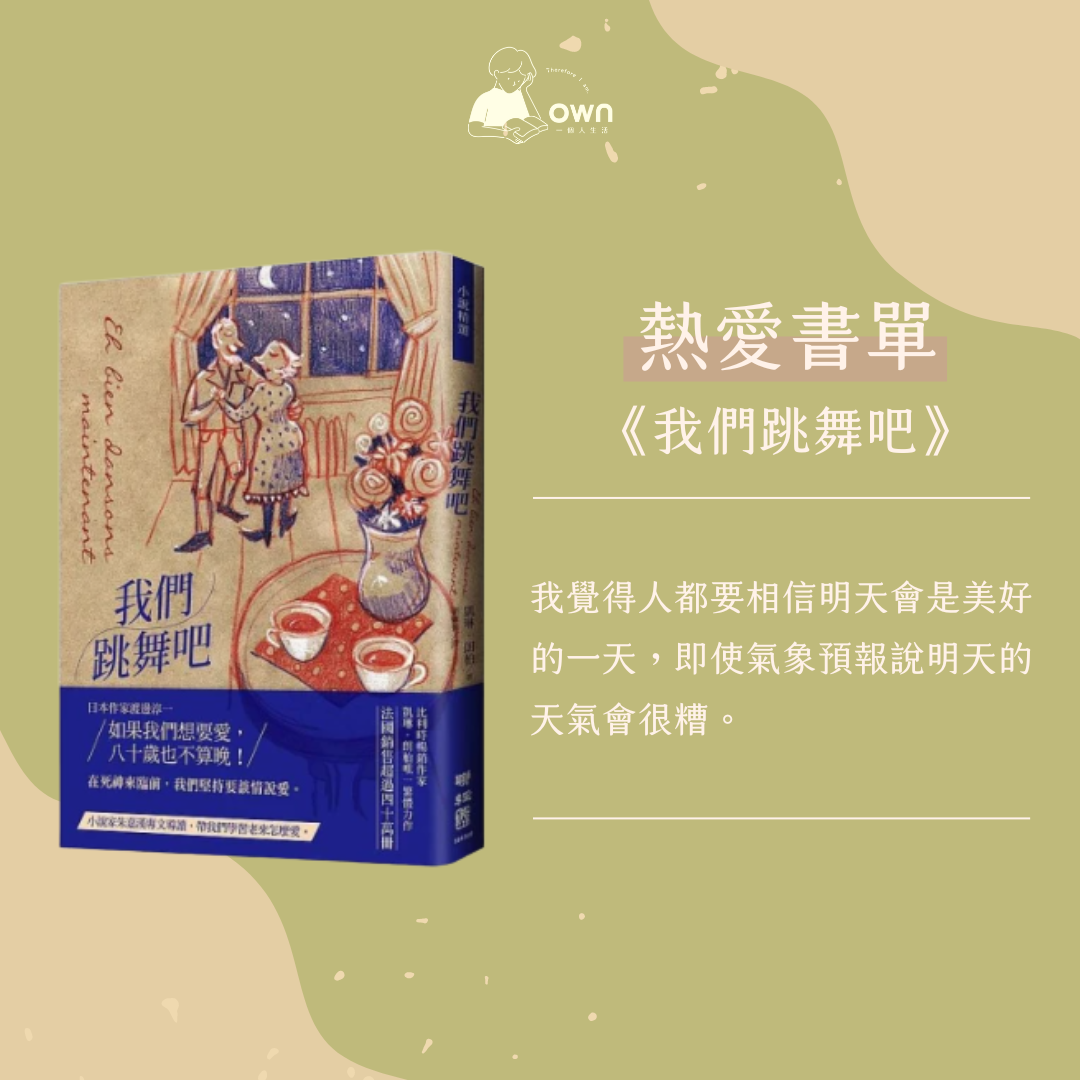 《我們跳舞吧》這本書告訴我們,就算滿頭白髮,每個人仍然有相愛的機會、被愛的可能,不論現階段的你們幾歲,處於何種狀態,勇敢的做自己、為自己追求想要的,跳出自己的熱愛之舞吧。