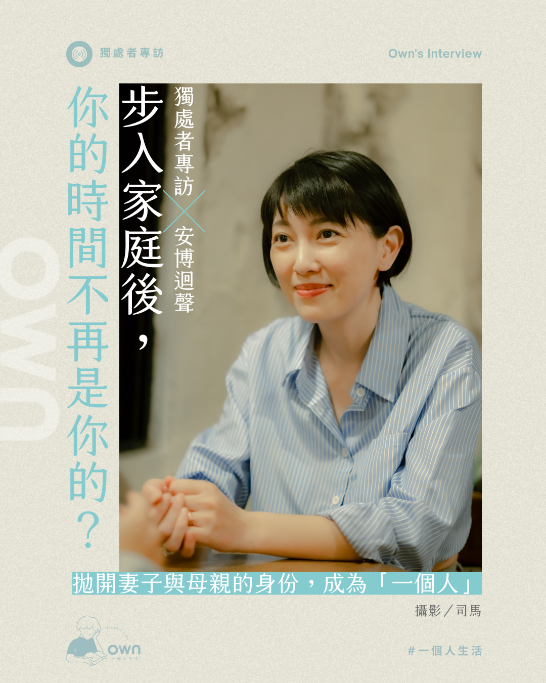 安博的婚姻關係讓人羨慕,但她不因此而美化婚姻,當問到給想結婚的年輕人忠告,安博笑著說:「不要結婚、不要生小孩。」這句話聽起來斬釘截鐵,實際上是她對年輕人的提醒——如果沒有做好心理準備,就不要輕易踏入婚姻。